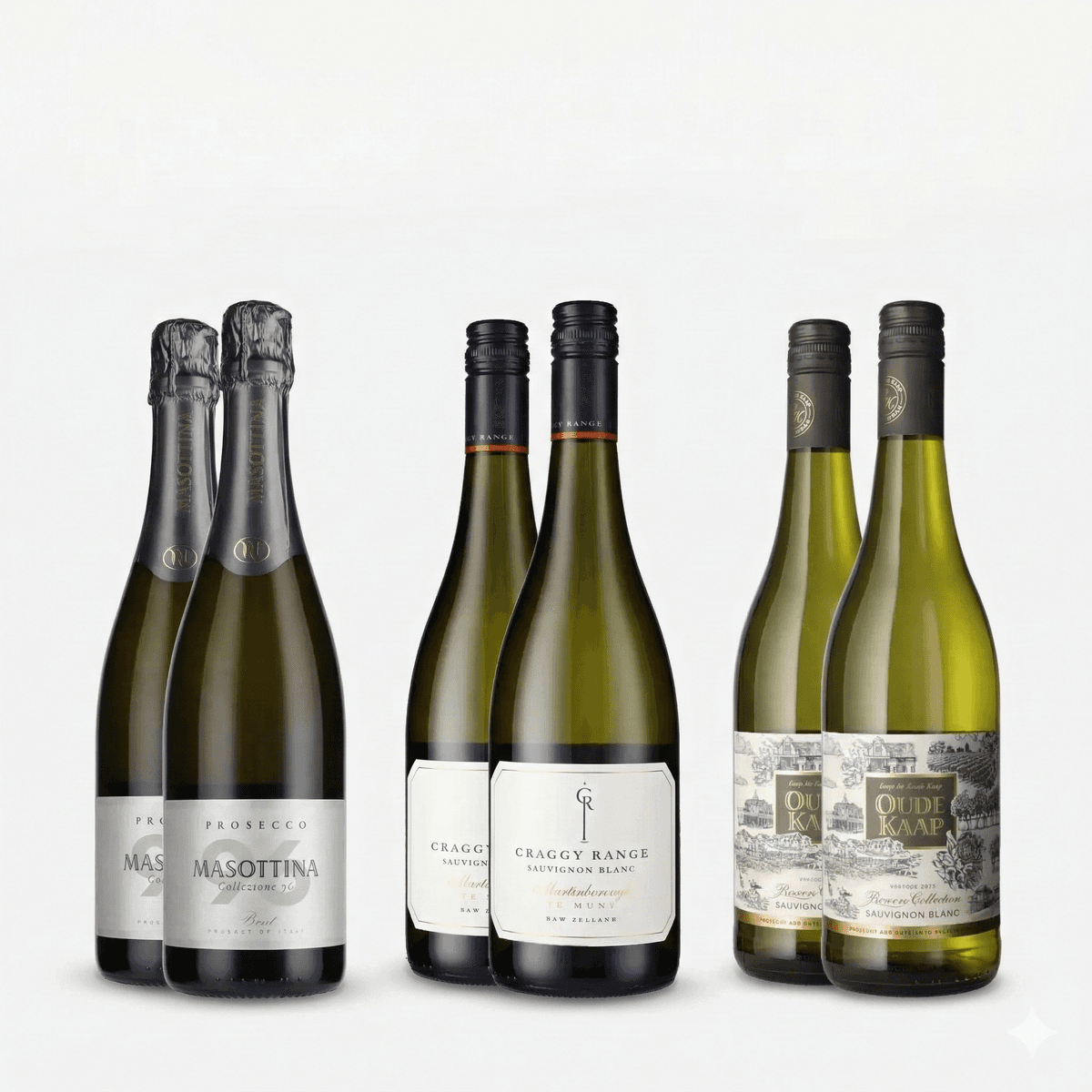 Två flaskor Masottina Prosecco Brut Treviso bjuder på fina bubblor och toner av päron och citrus, typiskt för norra Italien. Två flaskor Oude Kaap Reserve Sauvignon Blanc 2023 kommer från soliga Western Cape i Sydafrika och ger en rundare, tropisk fruktprofil. Slutligen bjuder denna låda på två Craggy Range Te Muna Road Sauvignon Blanc 2023 från Nya Zeeland, som visar druvans intensiva sida med aromer av lime, passionsfrukt och örter.